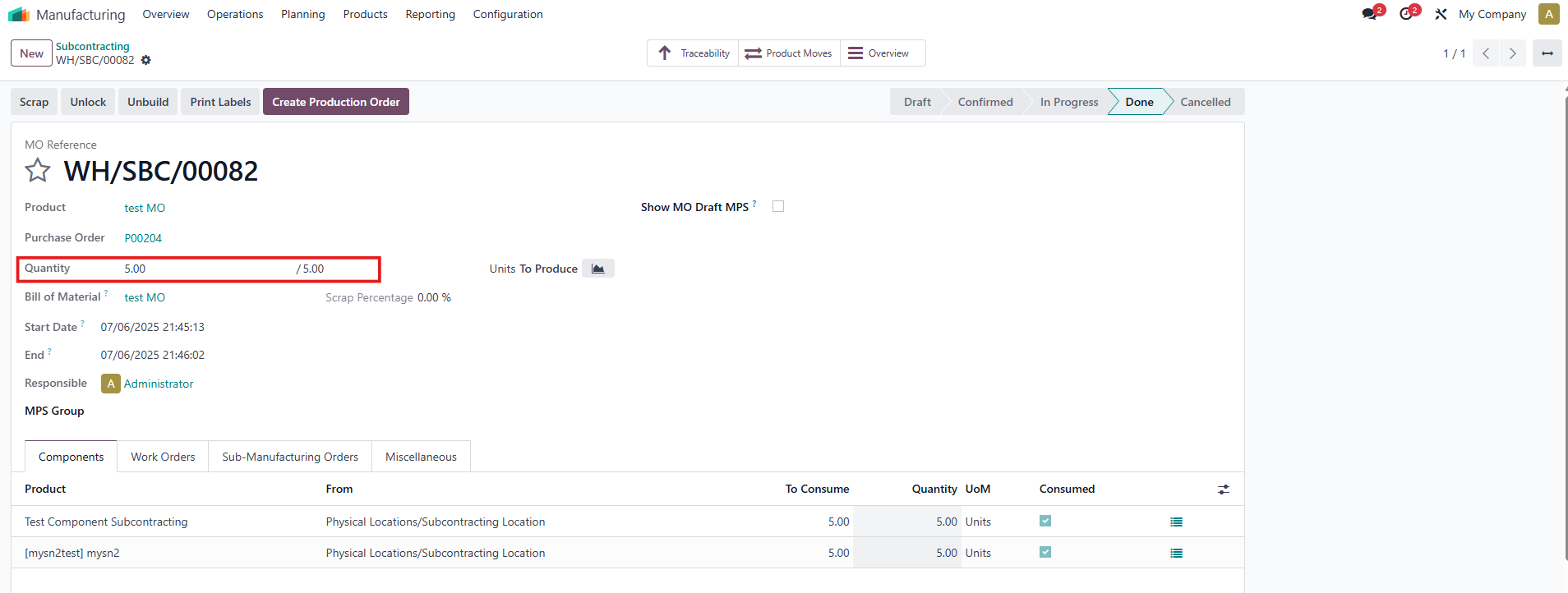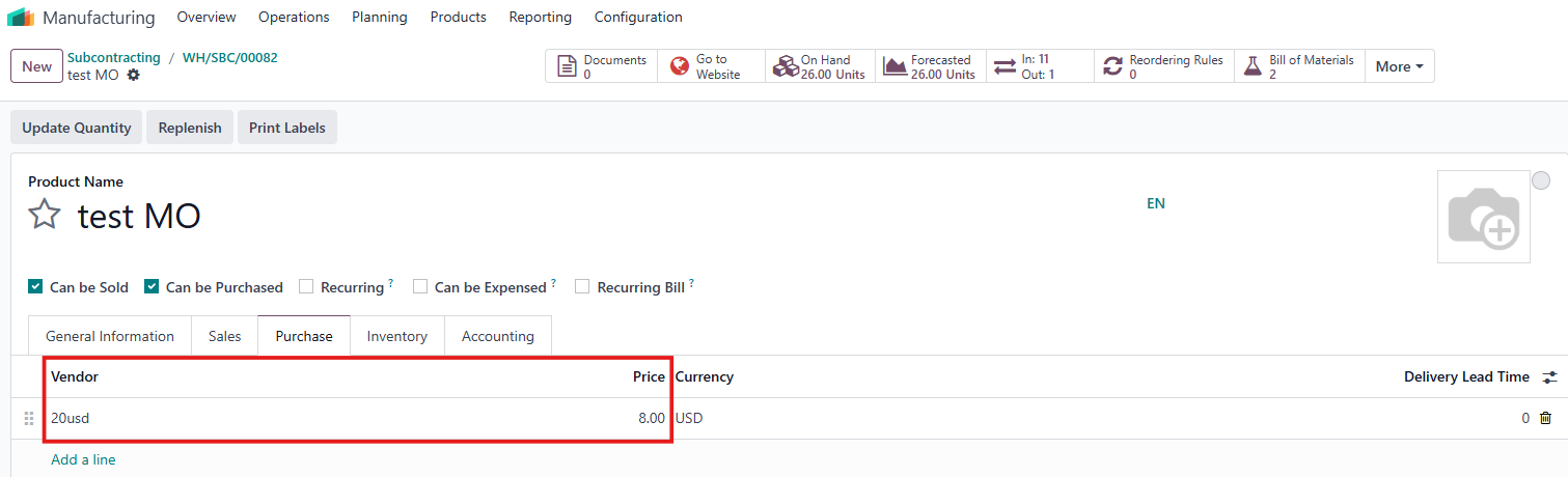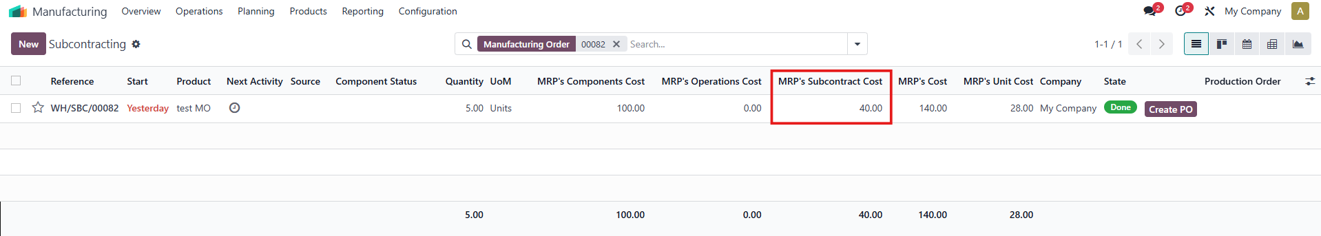 MRP’s Subcontract Cost = Total cost of subcontracted operations (if any) = The produced quantity in the subcontract x vendor's cost Example: If the quantity produced is 5.00 units, the vendor's price is 8.00 USD, then