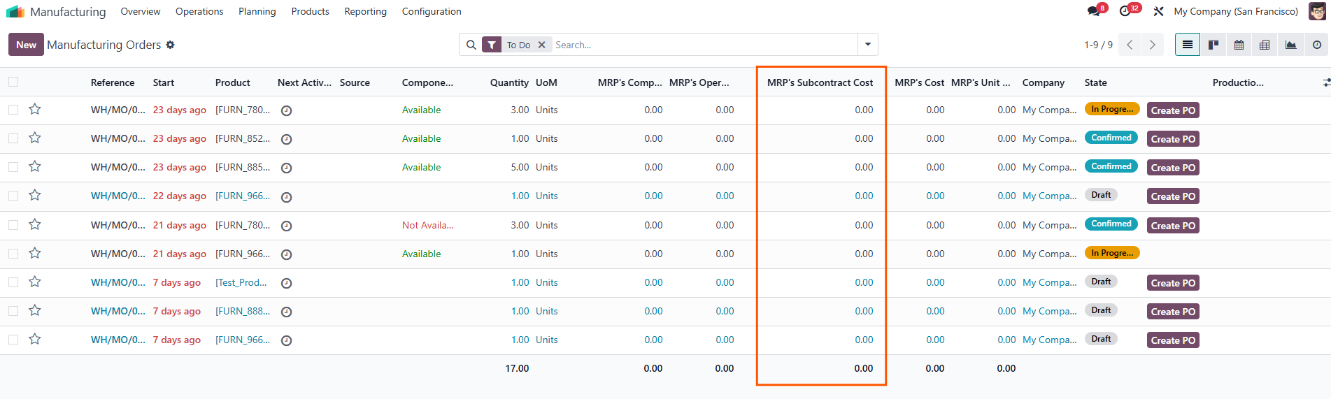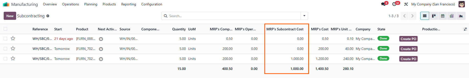Go to Manufacturing > Operations > Manufacturing or Subcontracting > We can see the MRP's Subcontract Cost column. | ![]() ![]() |