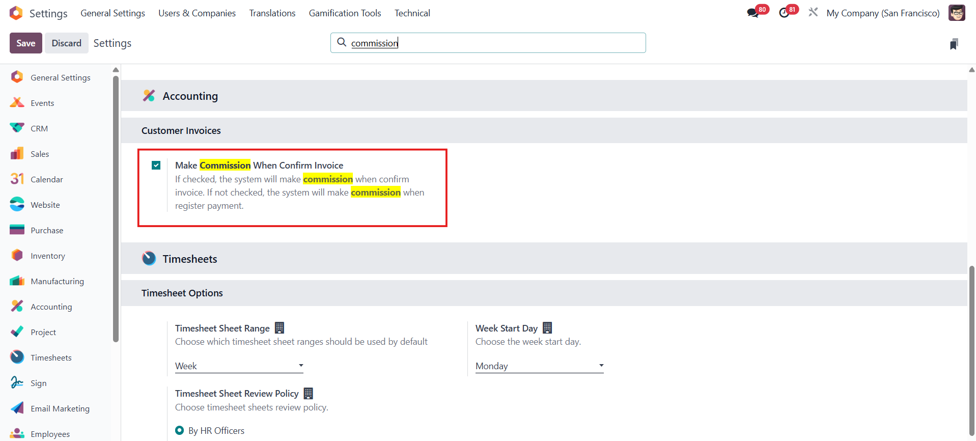 4. Go to Settings > Tick Make Commission When Confirm Invoice so that you can make commission when confirming the invoice. If not, the commission will be made when registering the payment. | ![]() |