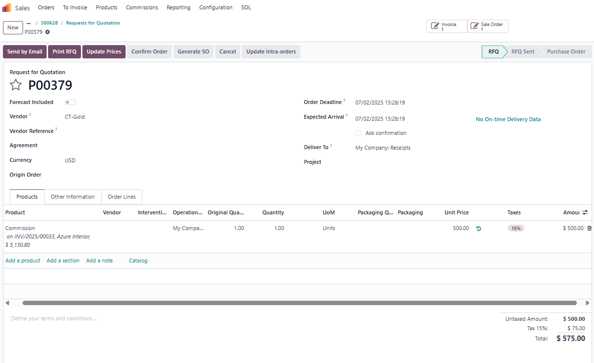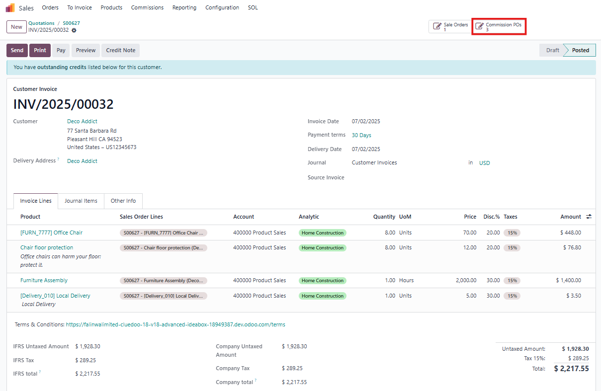 7. Back to Sales Order, create and then confirm the invoice, you can see a smart button "Commission POs" (which links PO commission with invoice and SO) | ![]() ![]() |