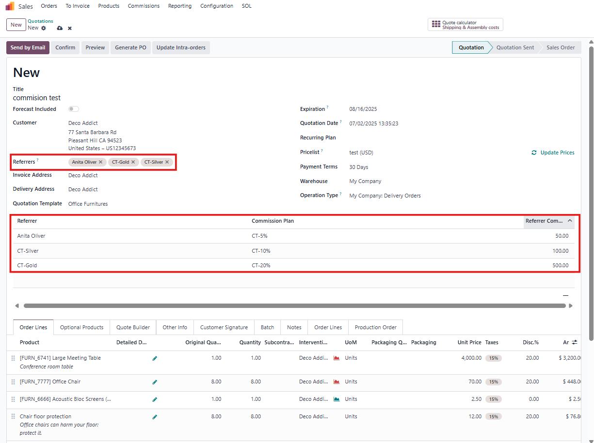 5. Go to Sales > Create a new Sales Order using products that belong to the product categories defined in the commission plan> Fill necessary information > Confirm order Note that one Sales Order can have more than one Referrer, and there will be a table with the commission amount for each referral | ![]() |
