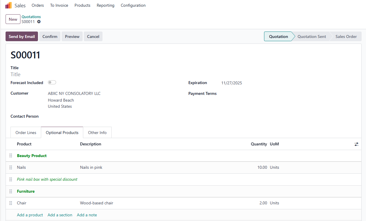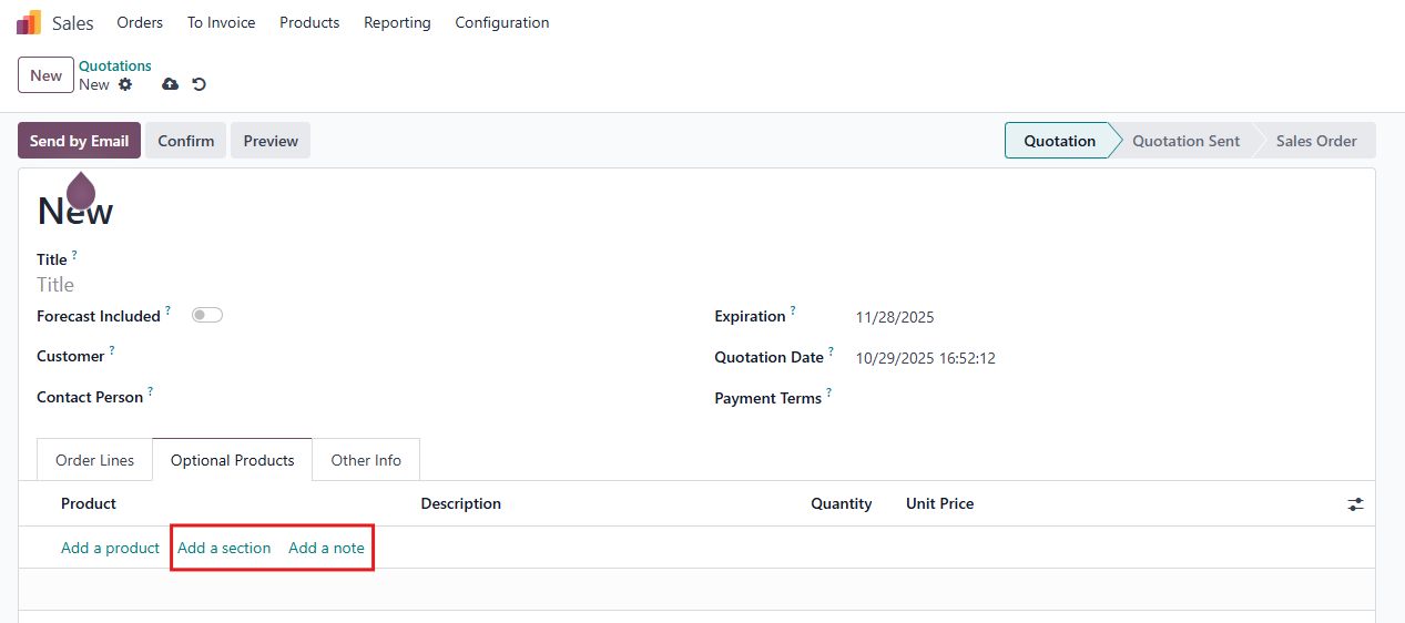 1. Go to Sales and create a new Sales Order > We can see Add a section and Add a note option under the Optional Products Products can be organized by clicking Add a section (and dragging/dropping section headers), and further explained with discretionary information by clicking Add a note. | ![]() ![]() |