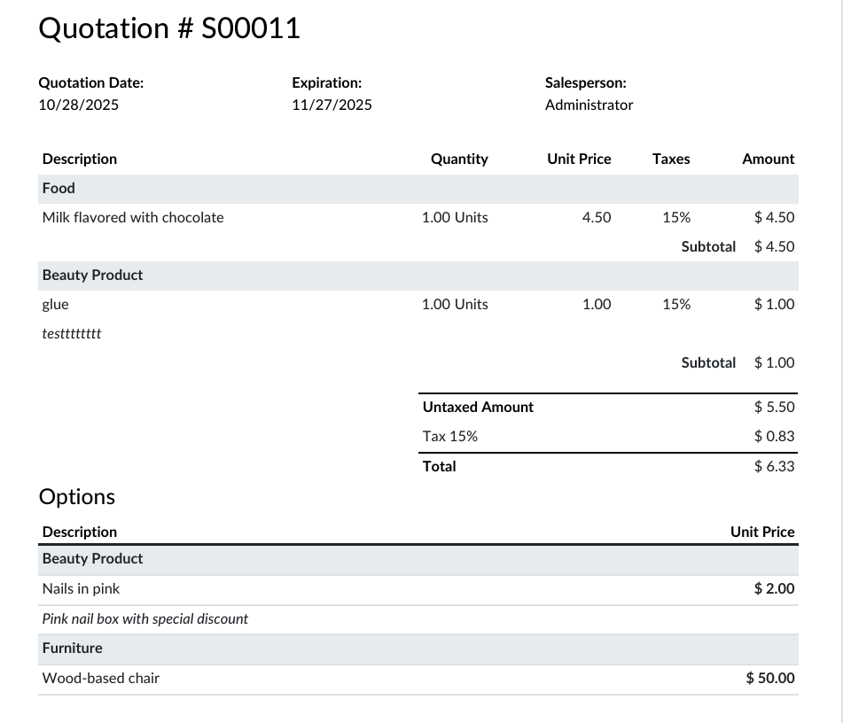 2. The Note or Section of the Optional Products also displayed in the quotation printing as in the main products. | ![]() |