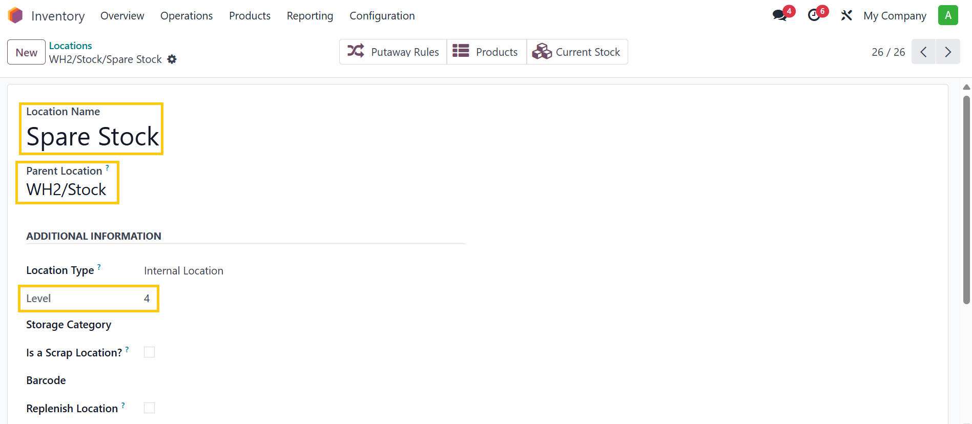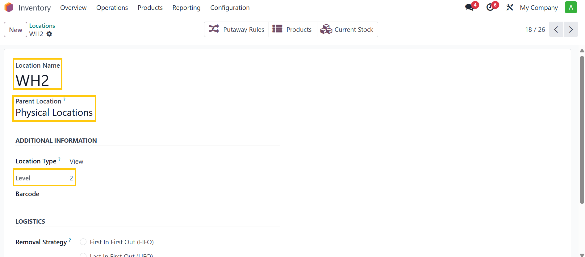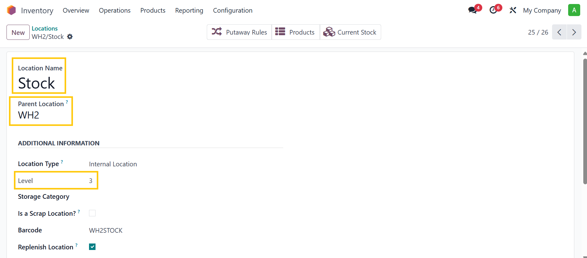In Odoo, Locations are standard warehouse or inventory locations without hierarchical level decomposition. By default, Odoo does not provide a built-in mechanism to assign multiple hierarchical levels (e.g., Level 1, Level 2, sub-levels) within Locations.